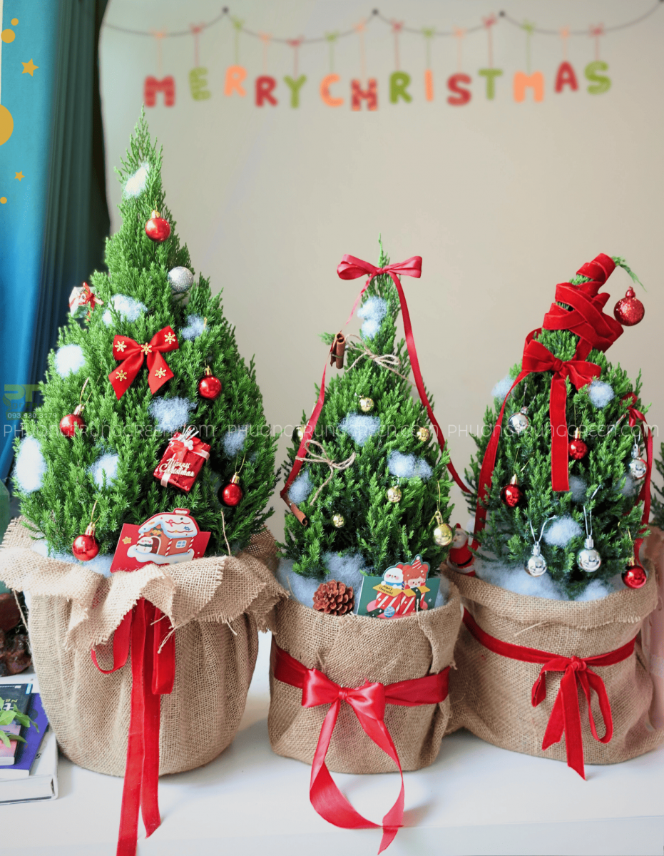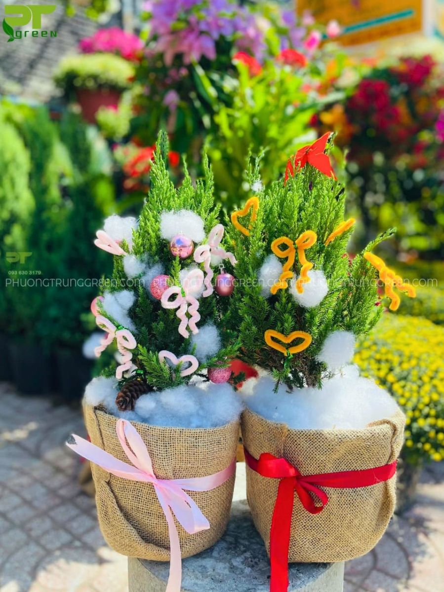Tất cả cây đều được bọc chân bằng bao bố trang trí cùng nơ ruy băng, tạo màu sắc Giáng Sinh ấm áp và thiện cảm.