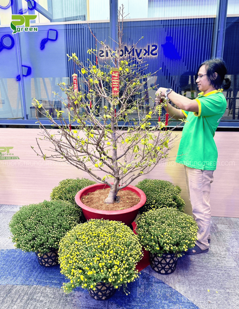 PT GREEN nhận thiết kế – thi công – decor tiểu cảnh mai Tết theo yêu cầu, kết hợp hài hòa giữa mai và các loại hoa Tết truyền thống: