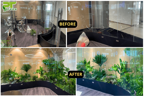 Qua khảo sát thực tế, PT Green đề xuất áp dụng giải pháp thiết kế – thi công tiểu cảnh cây nội thất, sử dụng các dòng cây phù hợp môi trường trong nhà như: