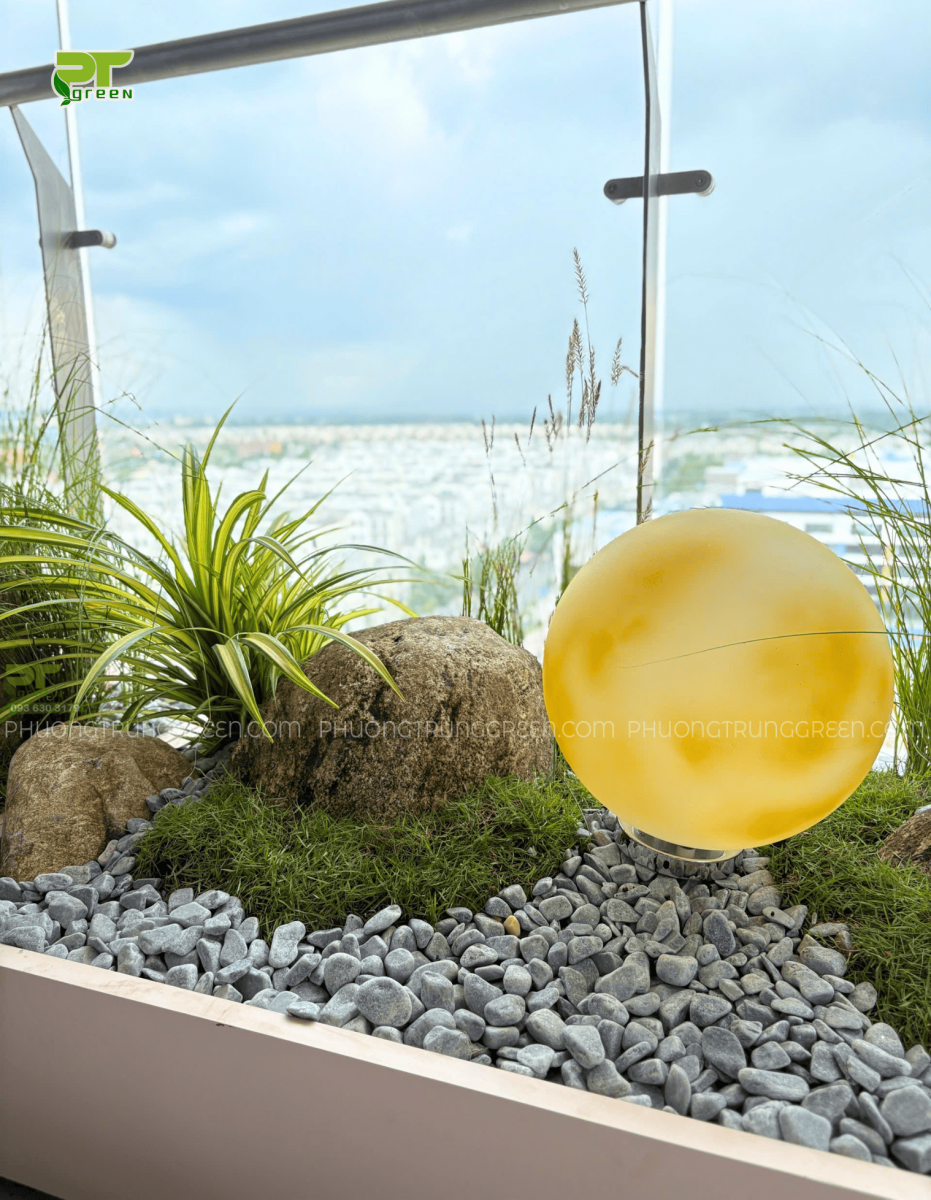 Ở căn hộ thứ hai, PT Green lựa chọn phong cách Zen Garden (vườn thiền Nhật Bản) – kết hợp đá cuội, thảm cỏ và cây lá màu như Lan chi, cỏ nến, cỏ lông heo, cây thân gỗ nhỏ.