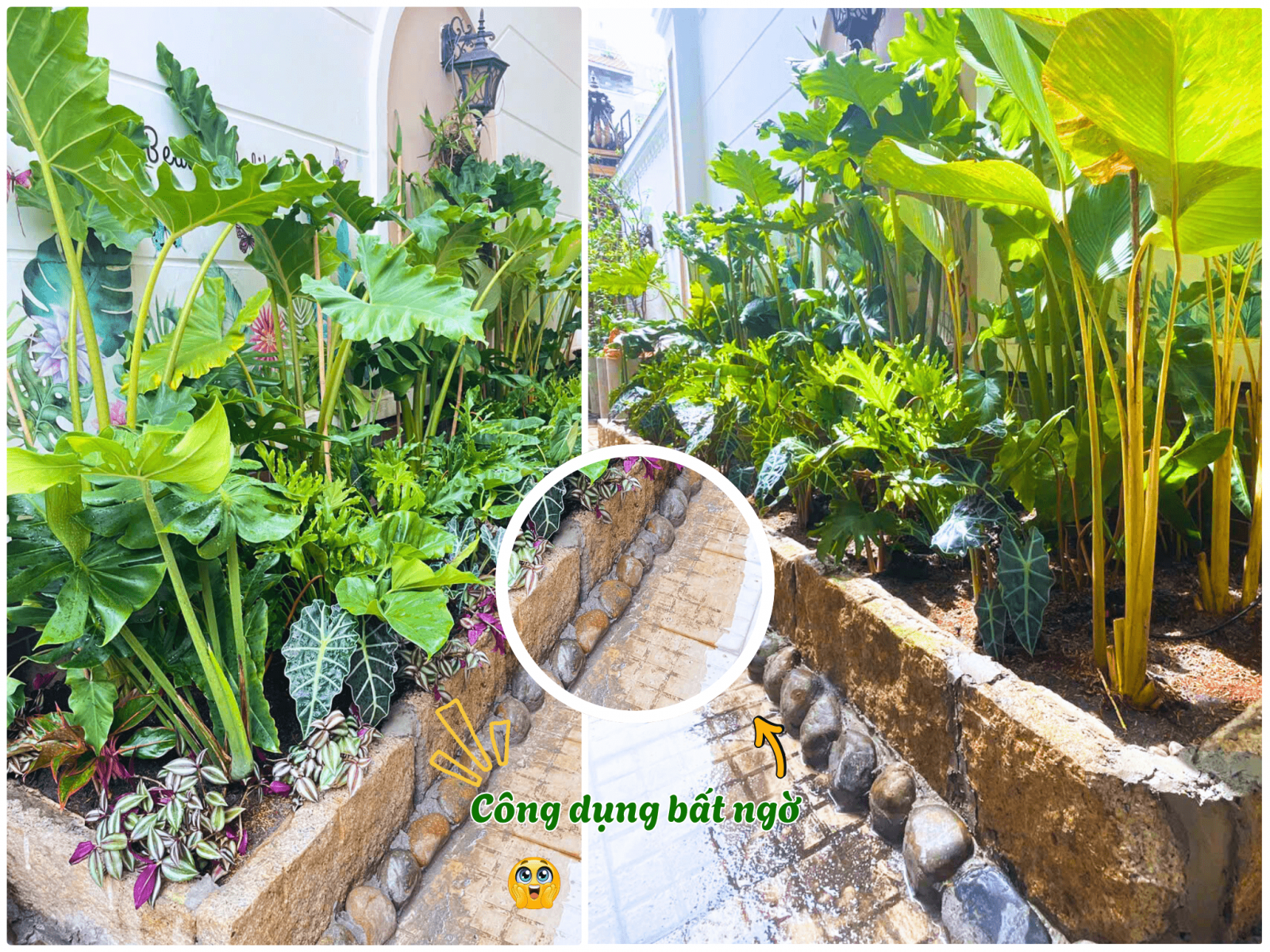 Đặc biệt, hàng đá cuội tròn được xếp một hàng dài ở chân bồn hoa không chỉ mang tính thẩm mỹ mà còn có công dụng bất ngờ: