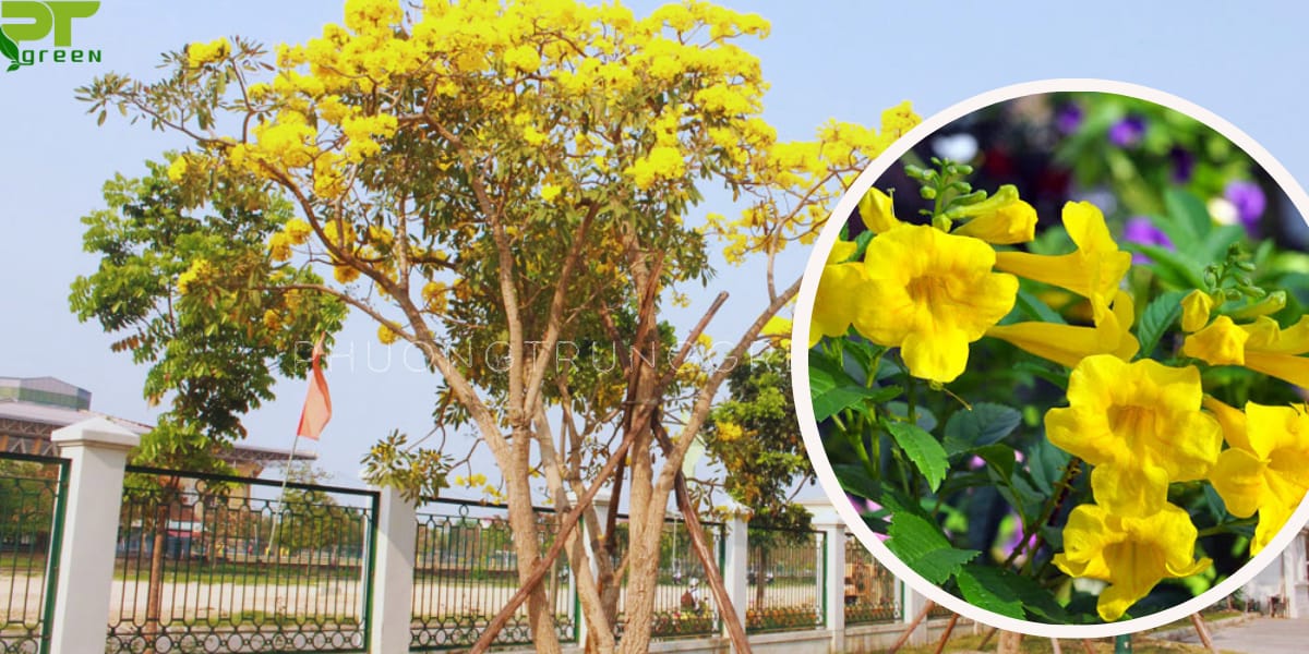 - Nổi bật nhất chính là hoa của nó. Hoa có dạng một chiếc chuông, hoa to và vàng óng rực rỡ. Khi đến mùa ra hoa thì cây sẽ rụng hết lá chỉ để lại còn những chùm hoa màu vàng rực. Cây thường ra hoa vào tháng 3 - 5.
