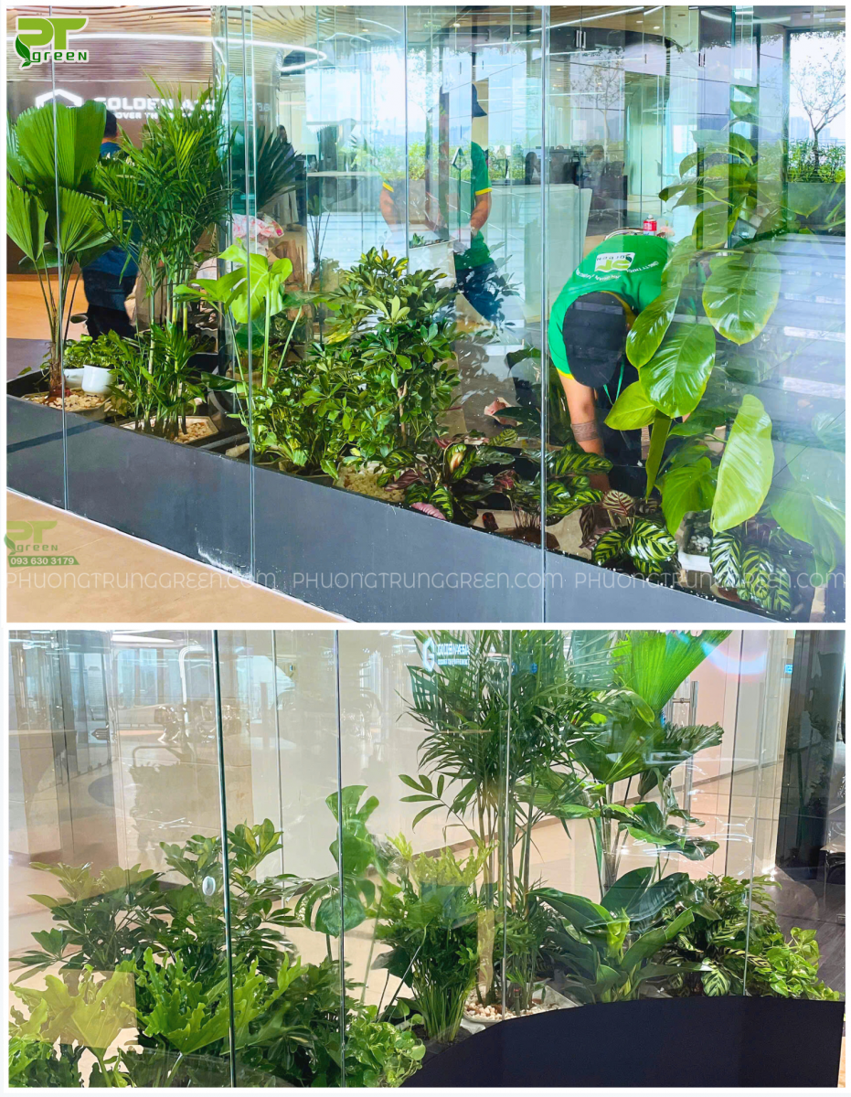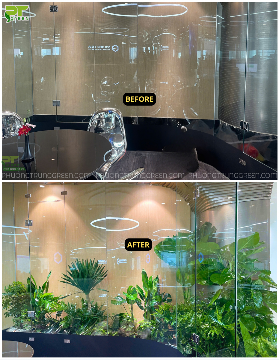 Không gian nội thất của doanh nghiệp ngày nay không chỉ cần đẹp mà còn phải tạo cảm giác dễ chịu, thư giãn và thể hiện được giá trị thương hiệu. Hiểu rõ điều đó, PT Green đã triển khai thi công mảng xanh nội thất cho Công ty Golden, mang đến một không gian tươi mới, hiện đại và đầy sinh khí. Dự án được hoàn thiện nhanh chóng, chỉn chu và đạt hiệu quả thẩm mỹ vượt mong đợi.