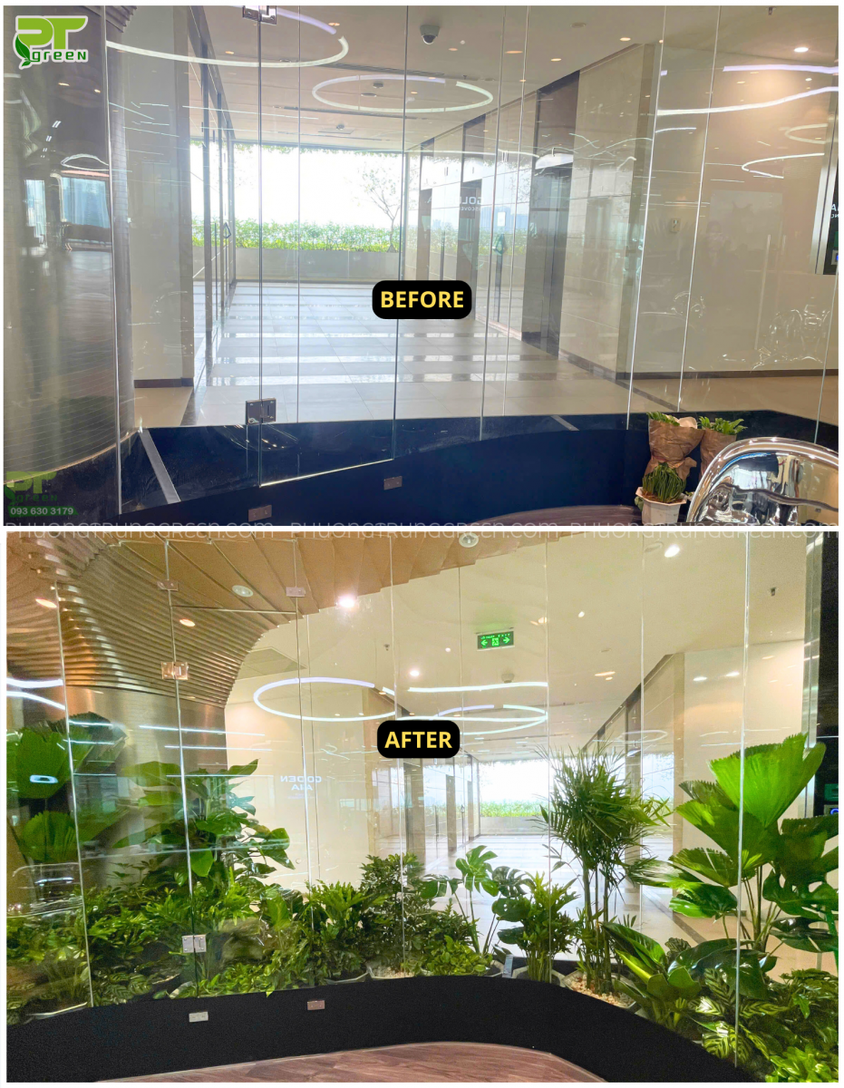 Nhìn vào những hình ảnh Before – After, có thể thấy hiệu quả thay đổi gần như “thay áo hoàn toàn” cho không gian Golden – đúng với tiêu chí thiết kế xanh bền vững mà PT Green hướng đến.