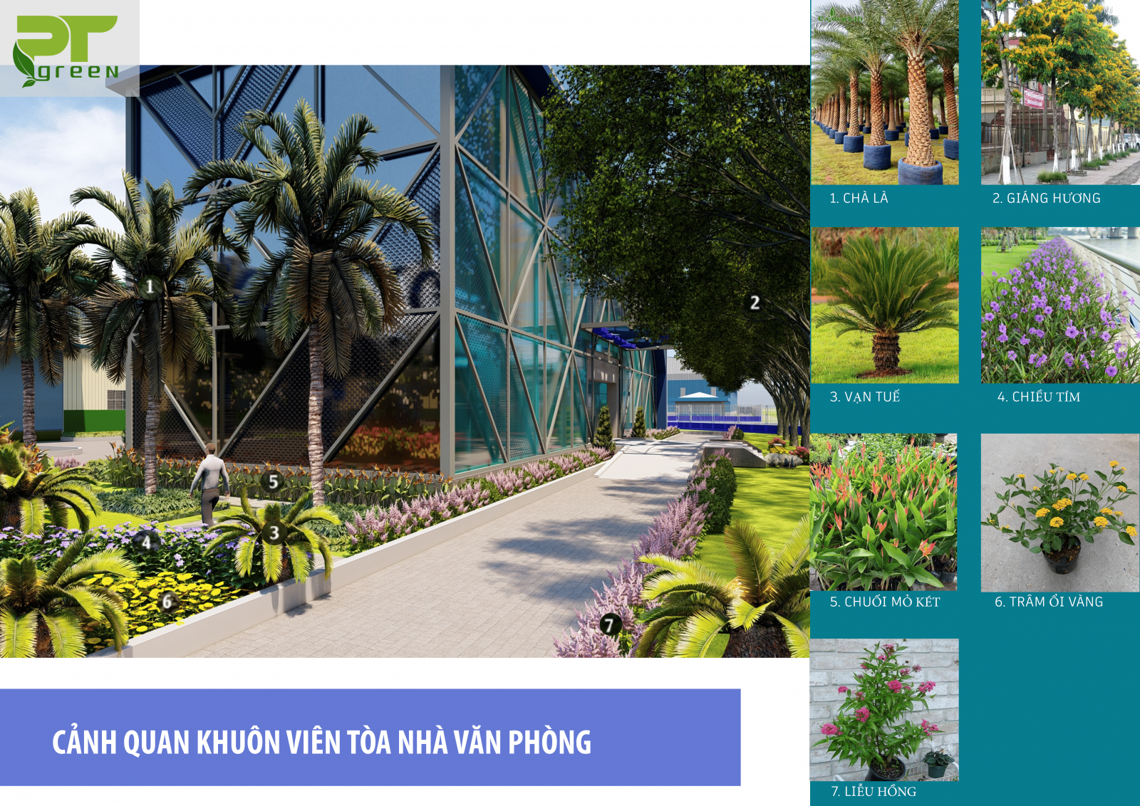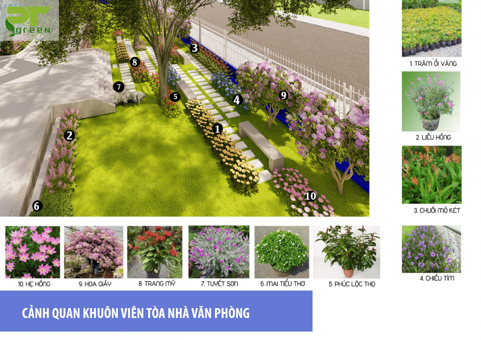Tổng thể cảnh quan được PT Green thiết kế theo phong cách hiện đại – cân đối – mạch lạc, sử dụng mảng xanh và sắc hoa sinh động làm điểm nhấn cho các khu vực chính: