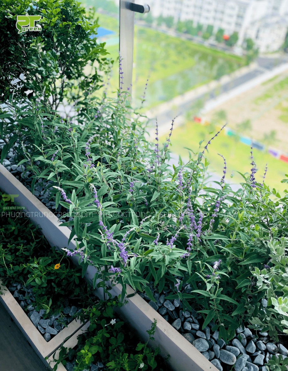 Những chậu trồng xếp lớp, xen kẽ sỏi trắng trang trí giúp tạo cảm giác gọn gàng, hiện đại nhưng vẫn gần gũi thiên nhiên. Khi ánh nắng chiếu qua, ban công trở thành góc chill lý tưởng để đọc sách hoặc thưởng trà.