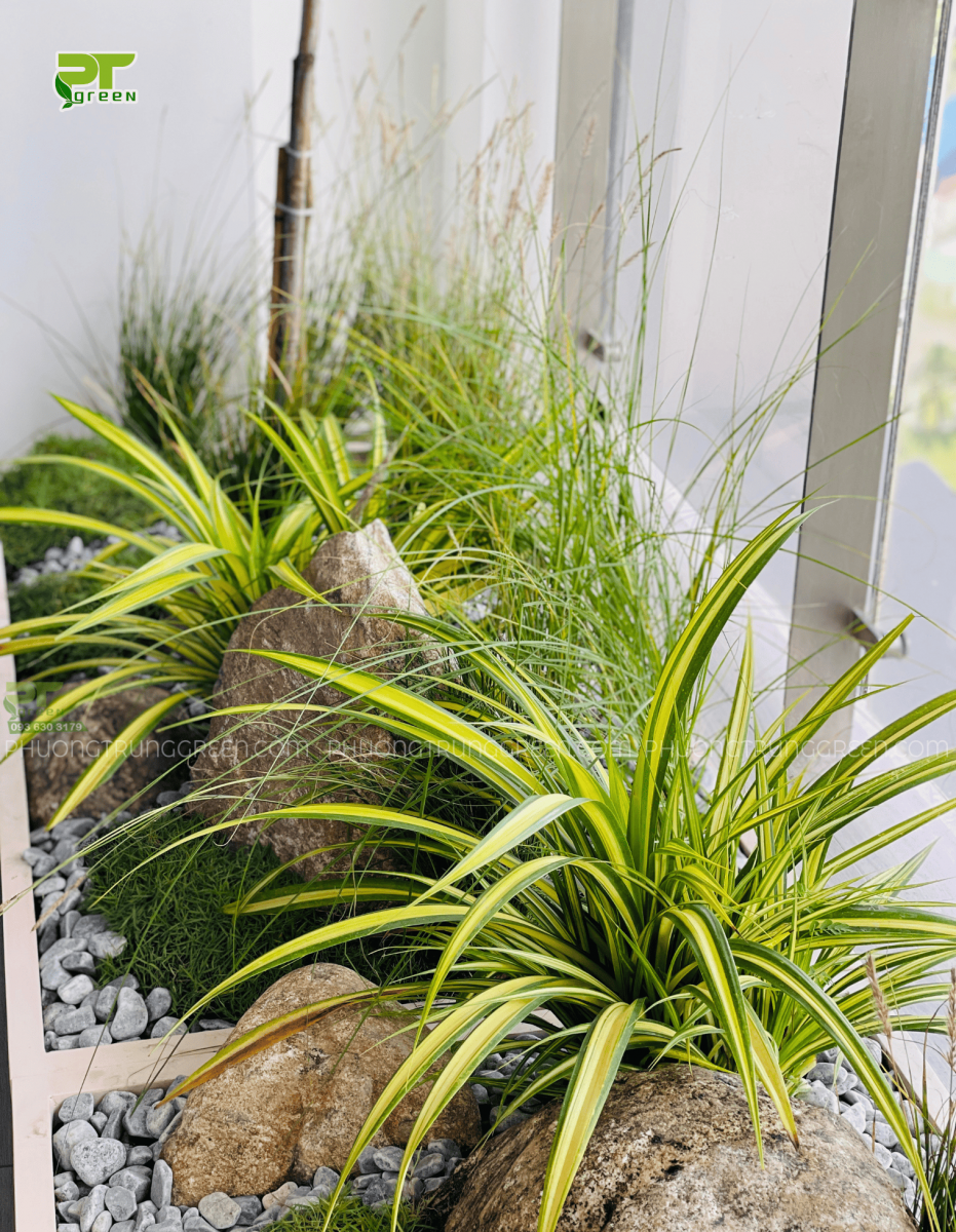 Ở căn hộ thứ hai, PT Green lựa chọn phong cách Zen Garden (vườn thiền Nhật Bản) – kết hợp đá cuội, thảm cỏ và cây lá màu như Lan chi, cỏ nến, cỏ lông heo, cây thân gỗ nhỏ.