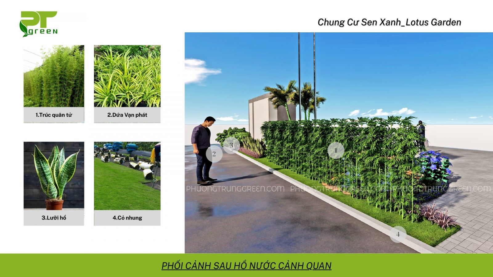 Với nhiều năm kinh nghiệm trong thiết kế – thi công cảnh quan đô thị, PT Green đã mang đến một bản phối cảnh 3D sinh động, thể hiện rõ ý tưởng “thiên nhiên trong lòng phố thị”, kết hợp tinh tế giữa yếu tố cây xanh, mặt nước và hệ thống chiếu sáng nghệ thuật.