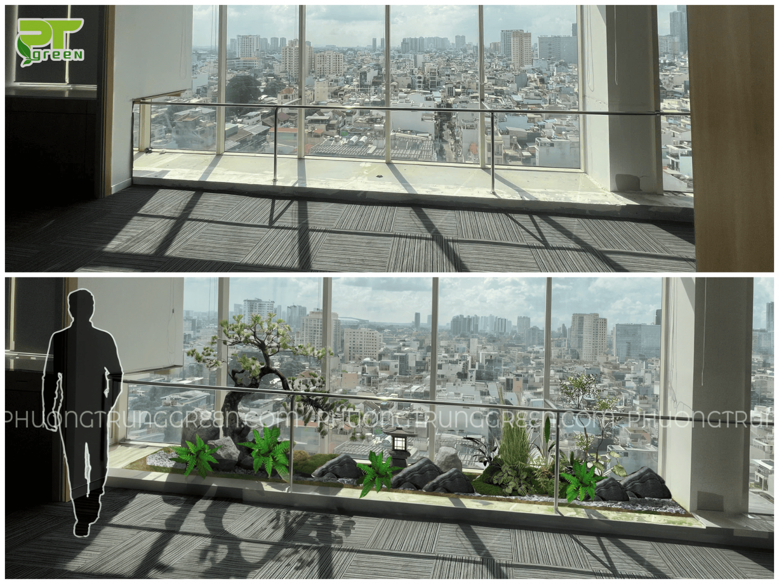 Khu vực sát kính được tận dụng tối đa với tiểu cảnh cây xanh kết hợp đá, đèn trang trí và bonsai, tạo nên một góc xanh thư giãn và sang trọng.