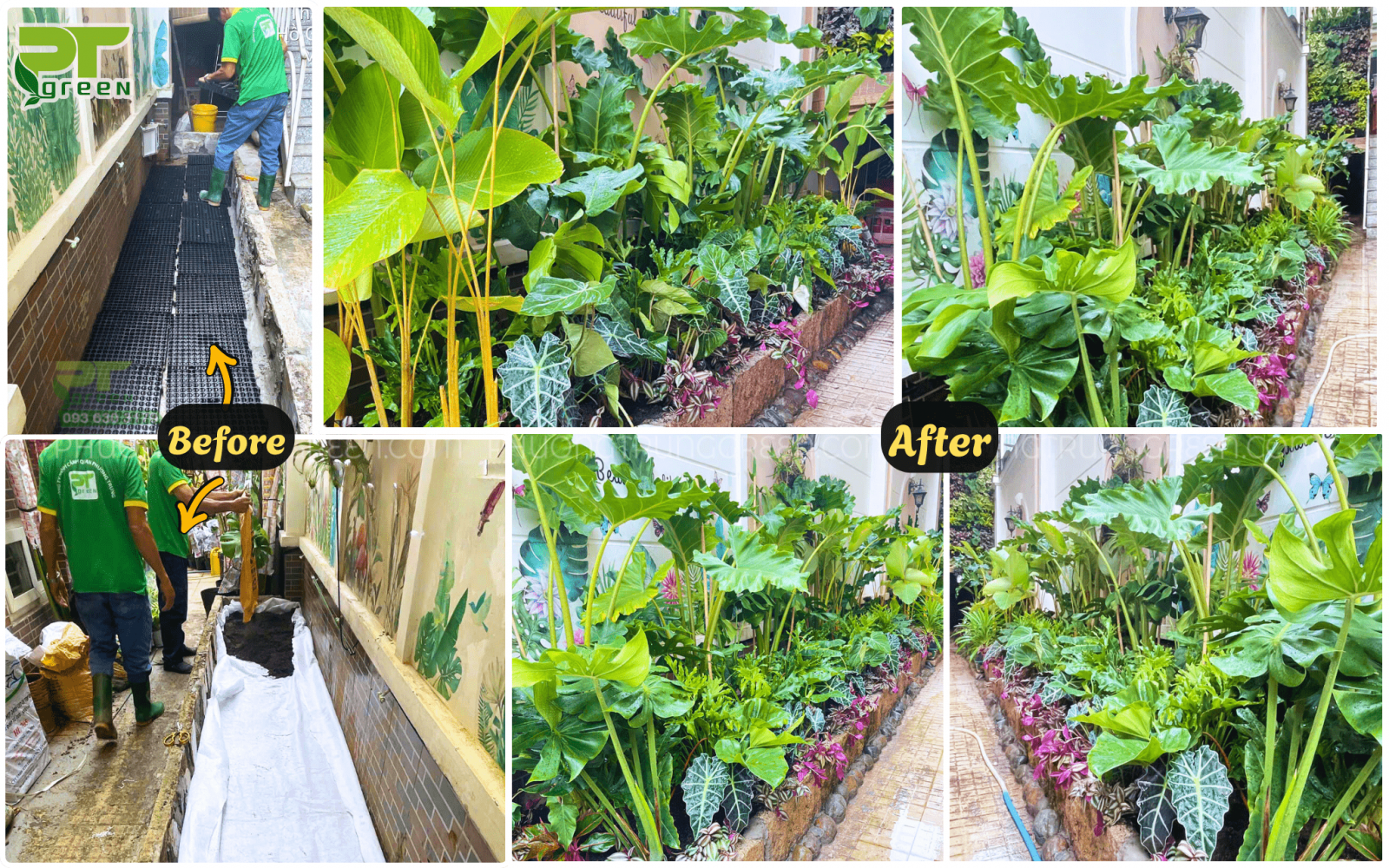 Trong không gian đô thị chật hẹp, việc tận dụng từng khoảng tường, góc sân để tạo mảng xanh là xu hướng được nhiều gia chủ yêu thích. Hiểu rõ điều đó, PT Green đã mang đến cho nhà Ms. Lan một giải pháp toàn diện: thiết kế và thi công tường xanh kết hợp bồn hoa, vừa thẩm mỹ, vừa tối ưu công năng, giúp ngôi nhà luôn tươi mát và gần gũi thiên nhiên.