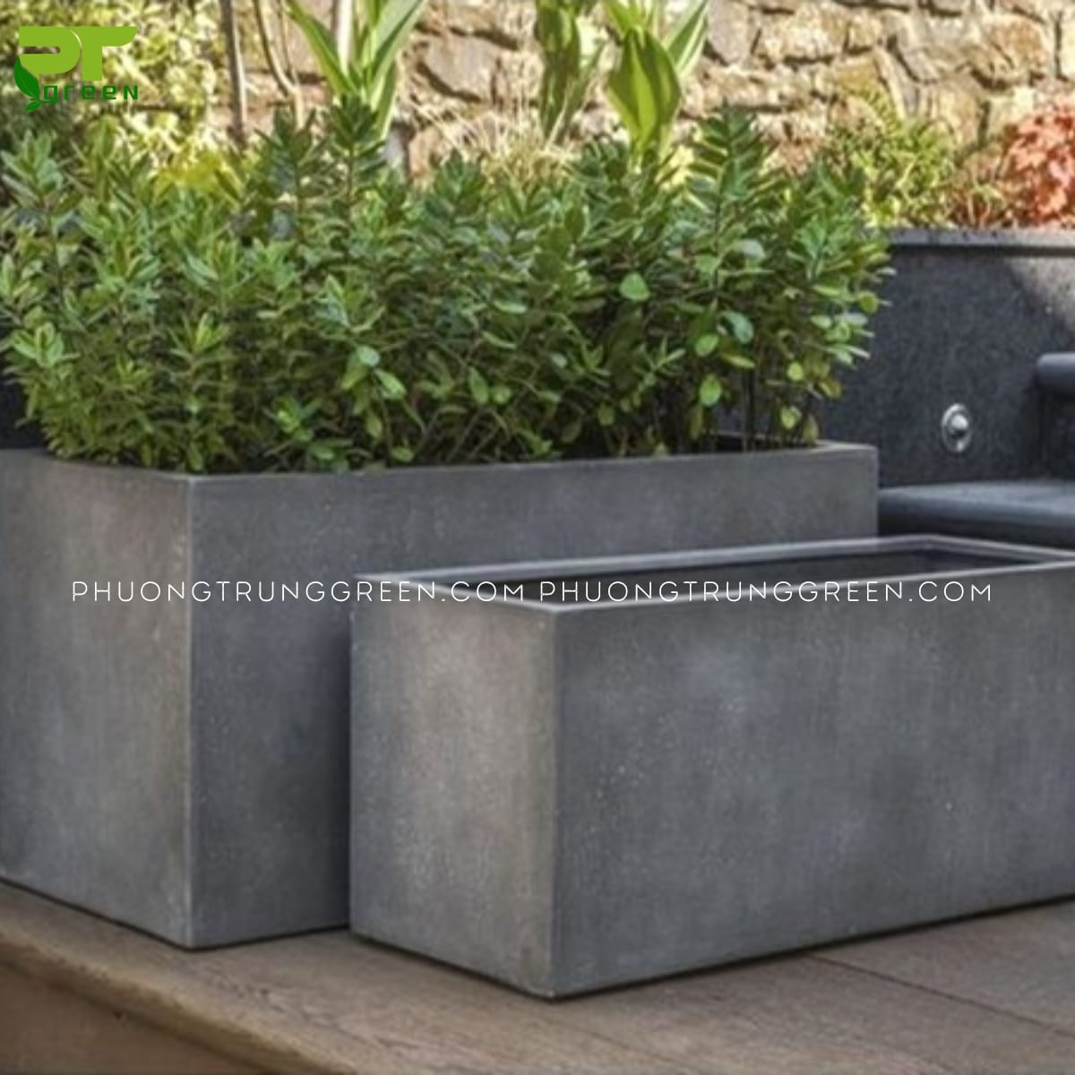 Chậu xi măng dạng hình chữ nhật đã rất quen thuộc và được sử dụng phổ biến trồng cây cho các không gian đô thị. Chất liệu thân thiện với môi trường, có thể đặt ngoài trời hoặc trong bóng mát đều phù hợp.